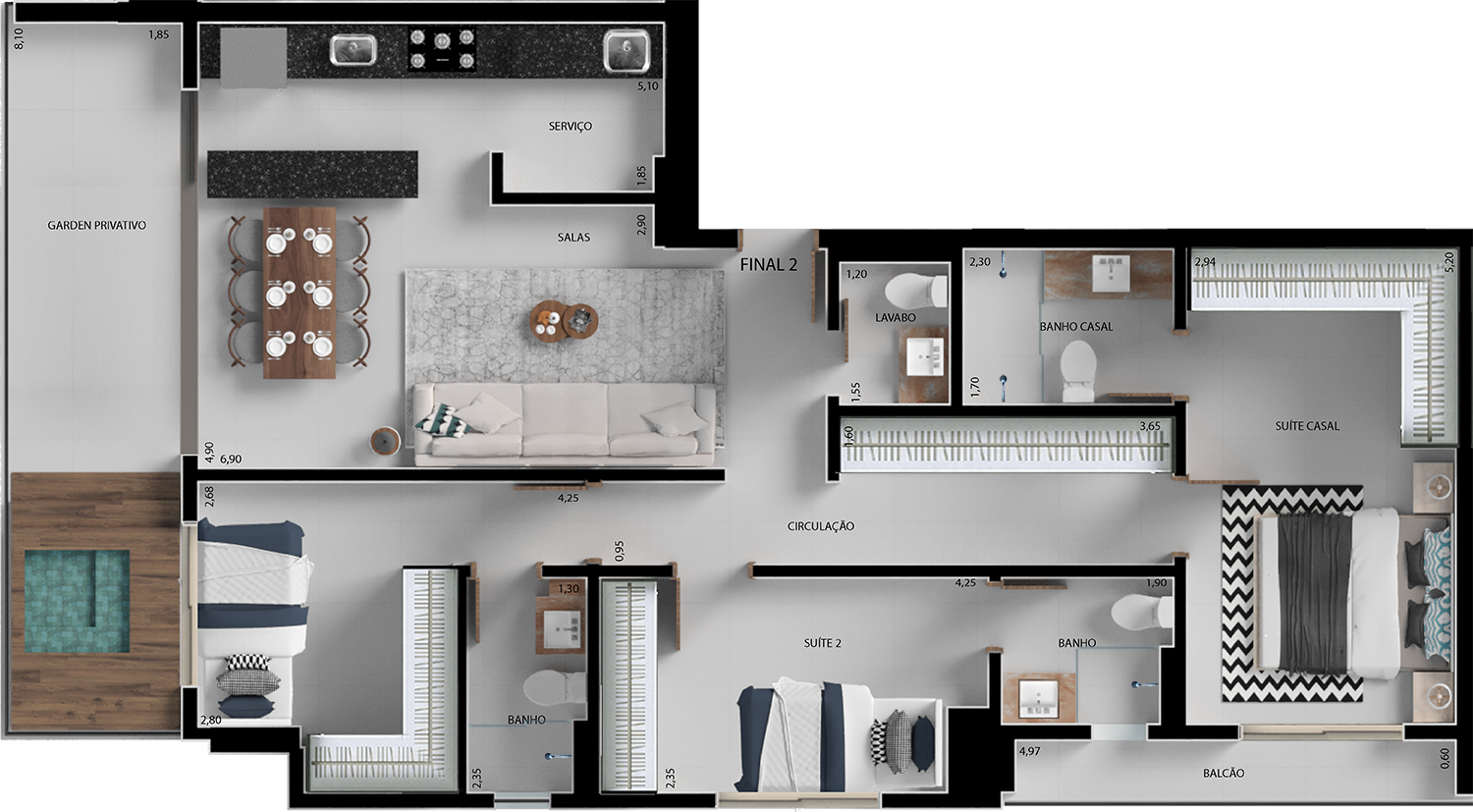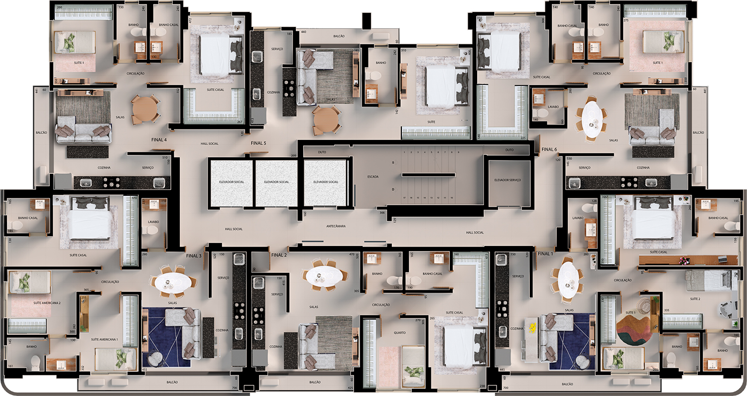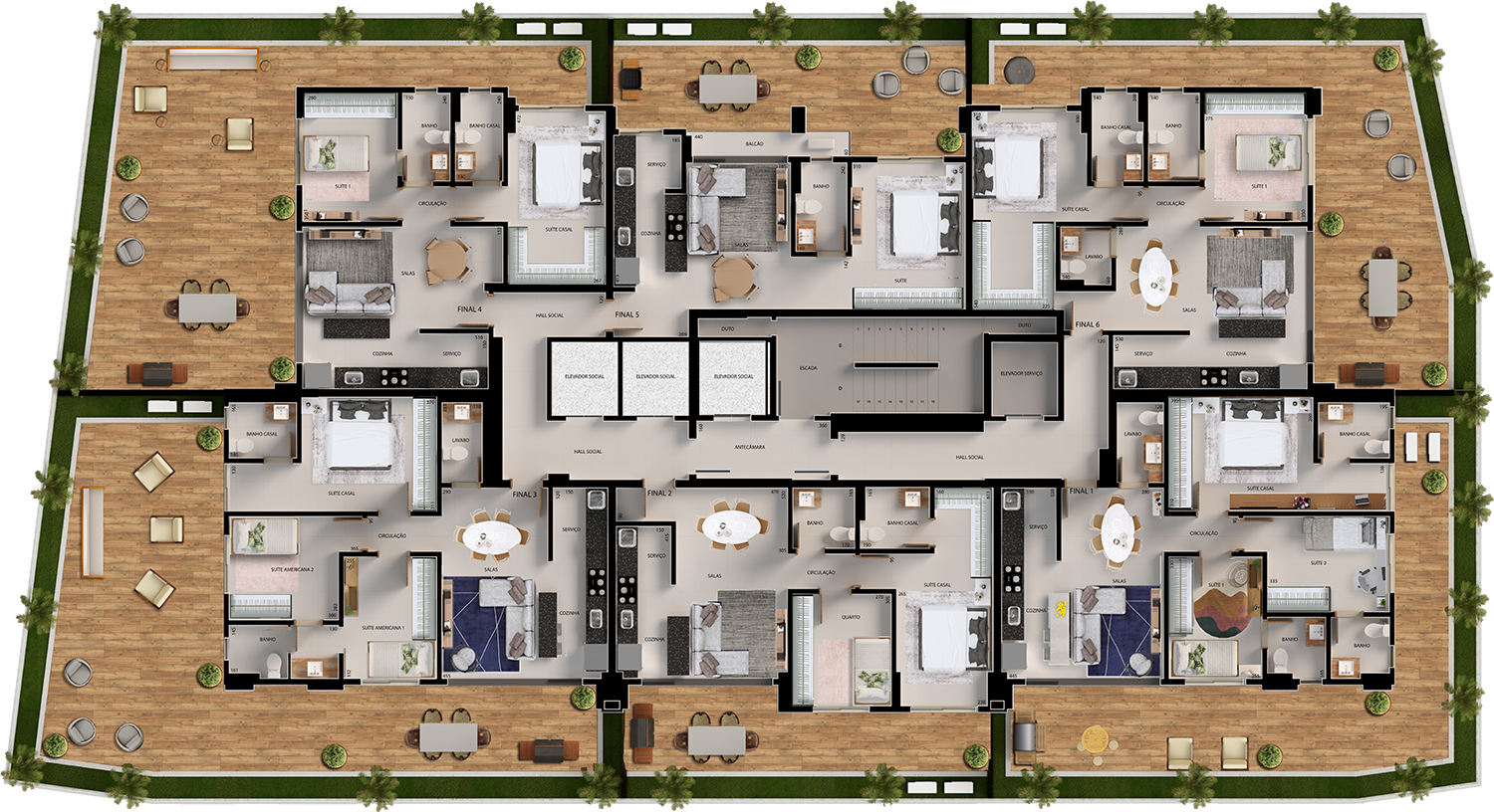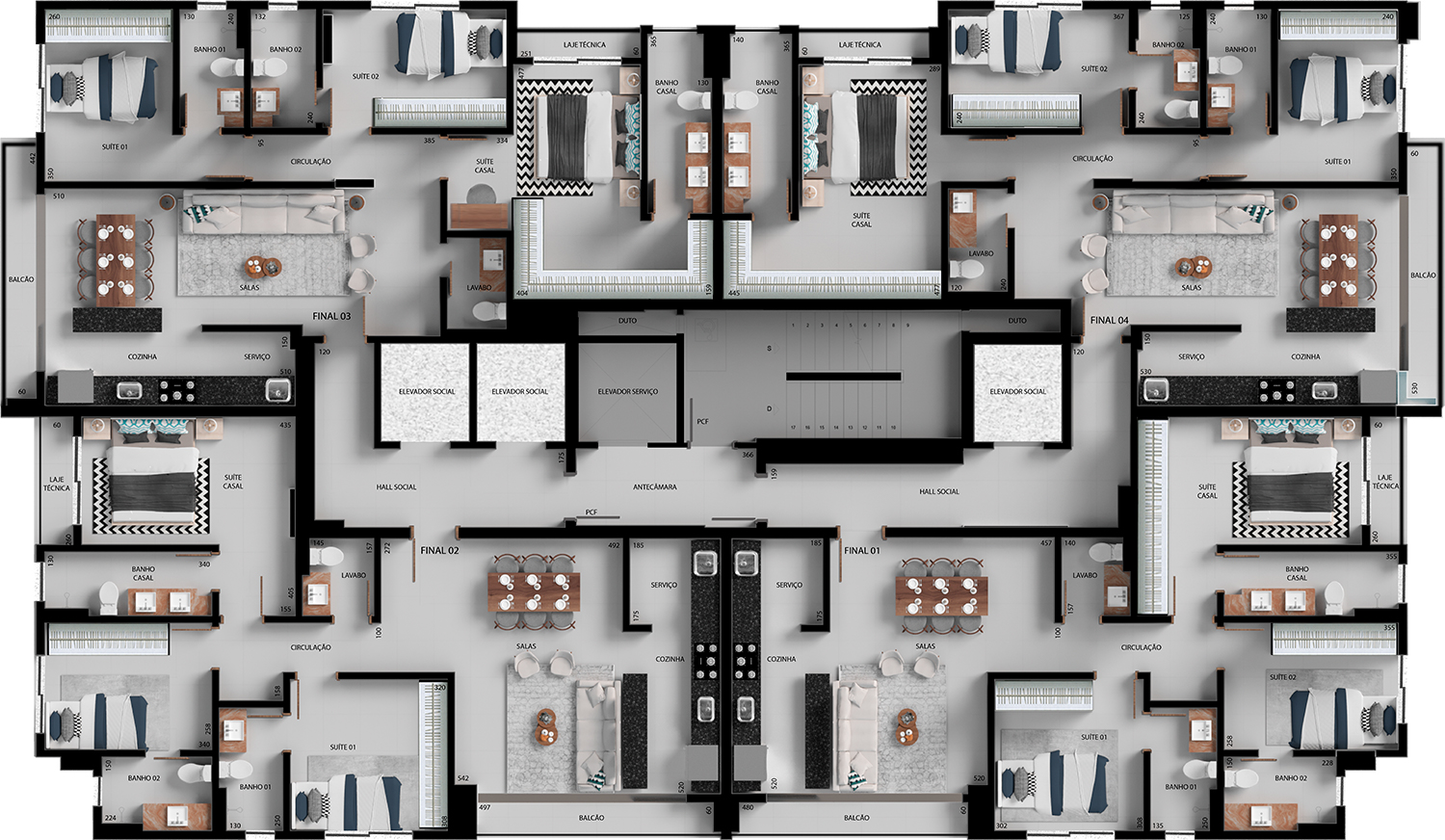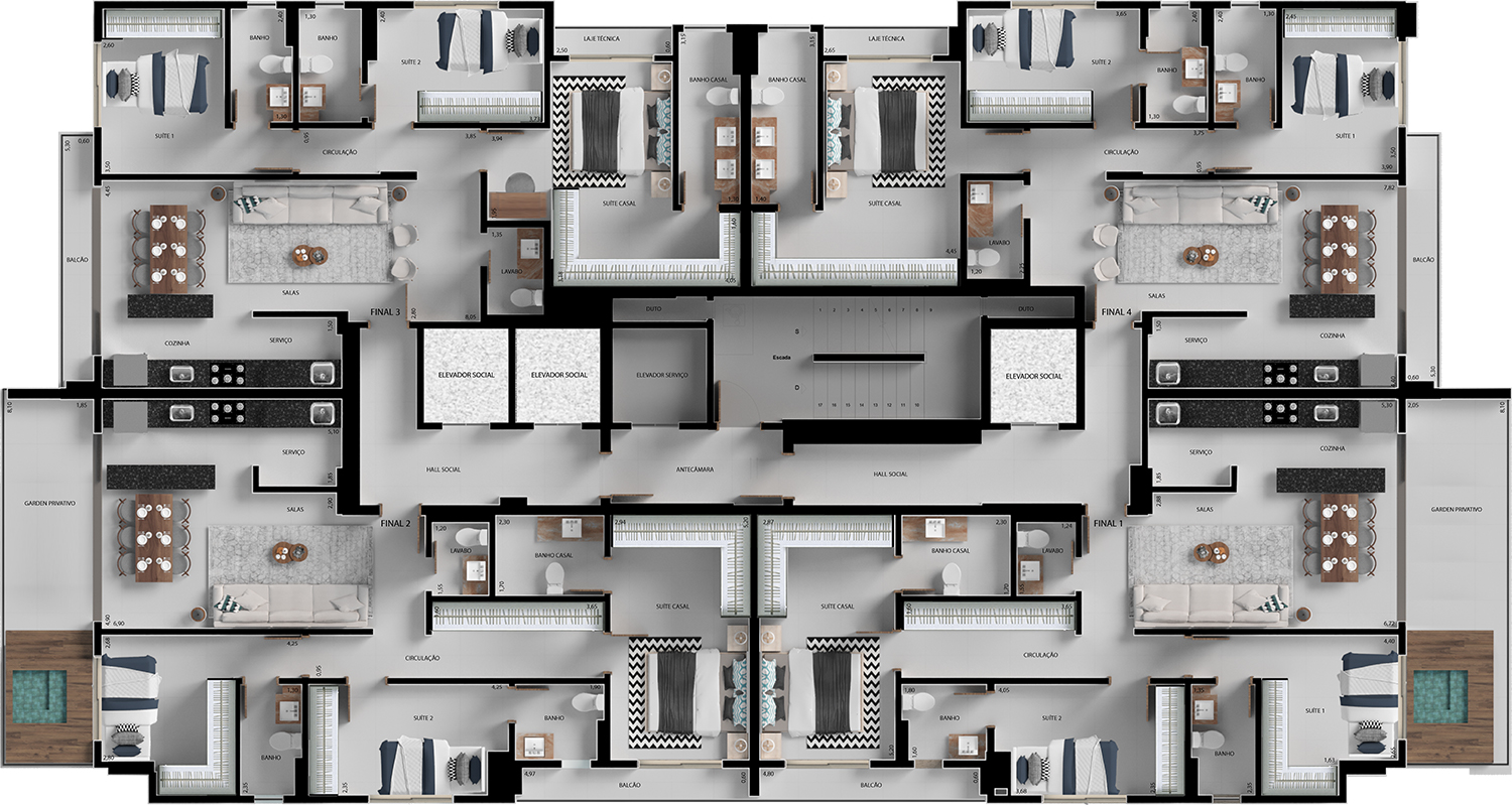 São apartamentos de 48 a 117 m² com 1, 2 e 3 suítes. Espaços com foco no conforto e com altíssimo padrão de acabamento.